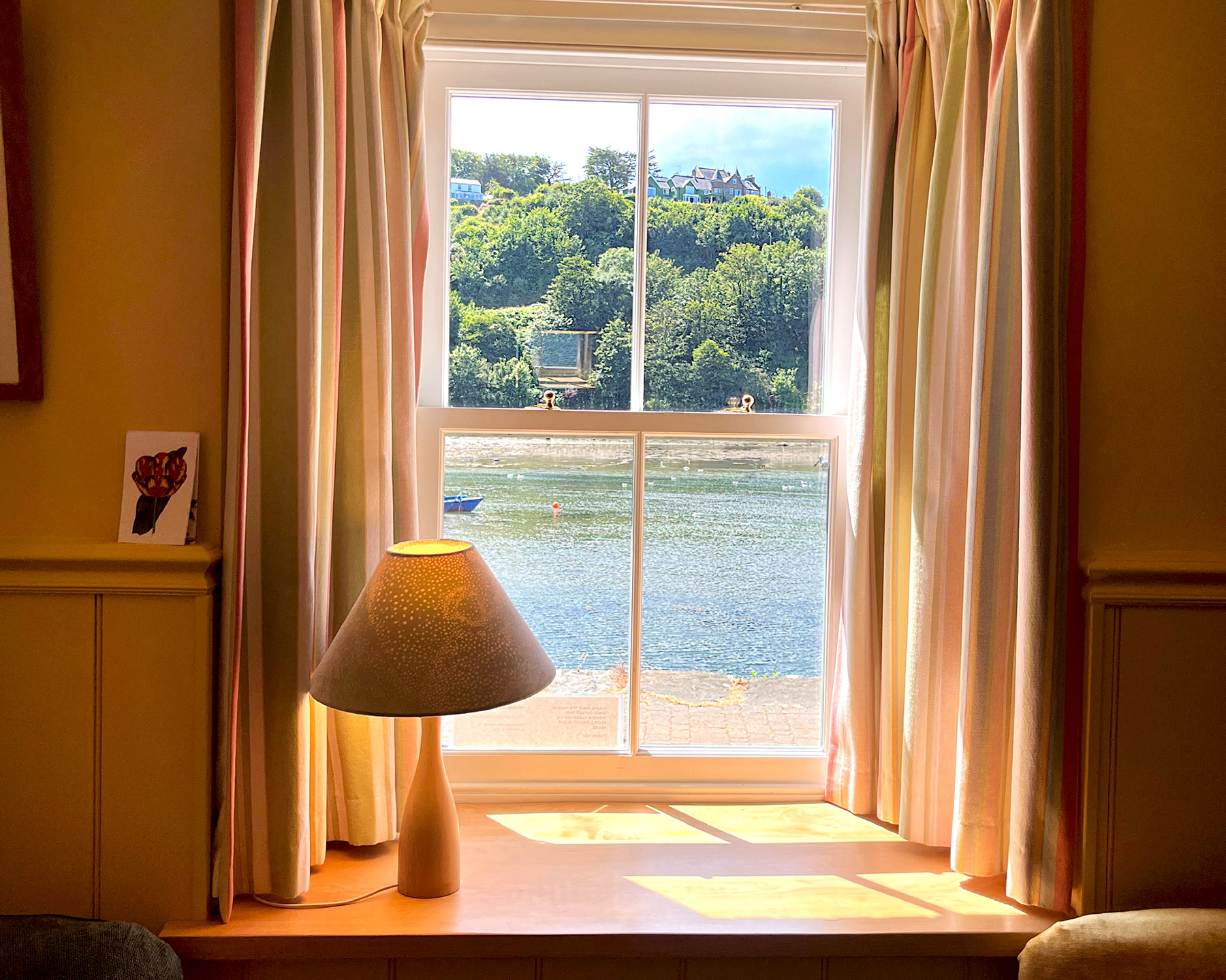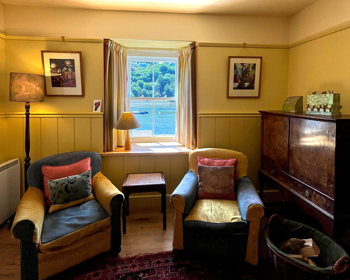 Up the stairs, with a lovely old wooden banister rail around the landing, are three harbour-facing bedrooms – one with a king-sized bed, the tiny “pink” room with a 2’6″ bed and the third room with twin beds (one with a trundle bed underneath). The two divans in this room can be made into a super-king on request. The good sized bathroom has a large separate shower, a bath, toilet and washbasin.
